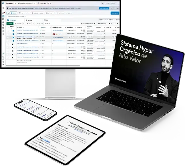 El sistema está diseñado para que seas autosuficiente. Después de 30 días, ya tienes tu máquina de ventas funcionando: contenido que atrae, propuesta que convierte, guión que cierra. Solo es optimizar con las métricas del Dashboard. Obviamente, si quieres escalar a $50-100K mensuales, ahí está BlueHackers, pero no es obligatorio para mantener los $10-20K extras que ya estarás generando.