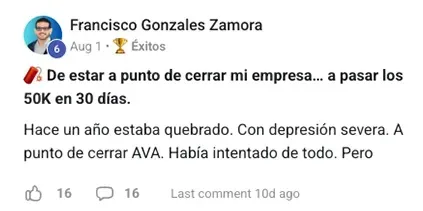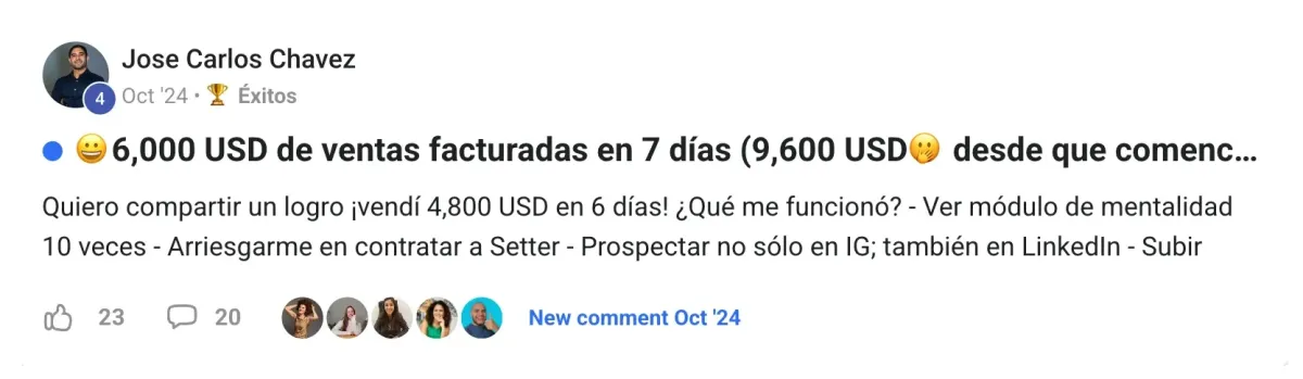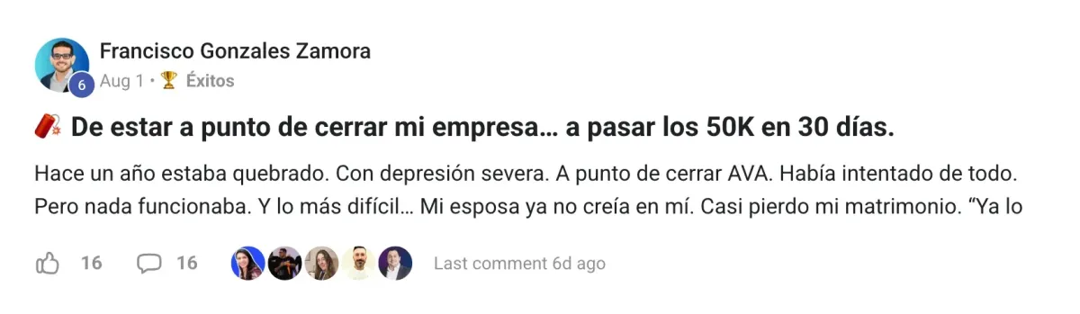 TODOS los líderes referentes del mercado han trabajado con nosotros para escalar, y contamos con +300 casos de éxito documentados escalados a 10-100K al mes. Hemos generado +9M USD personalmente con nuestro negocio y llevamos 8 años en el mercado